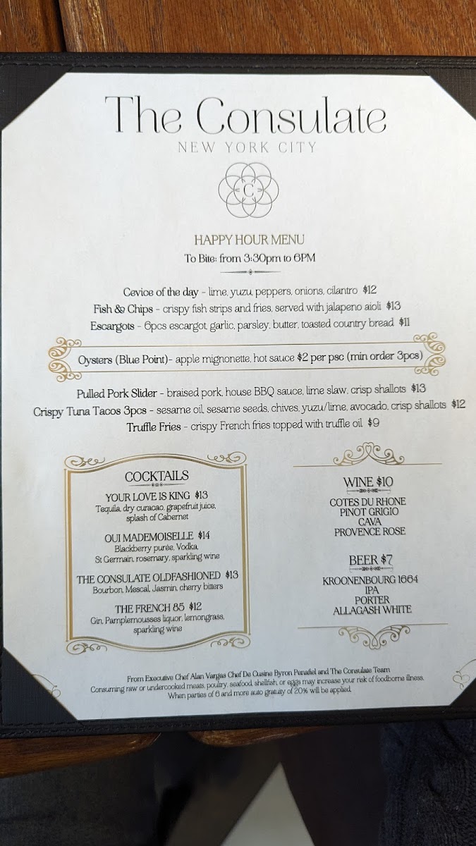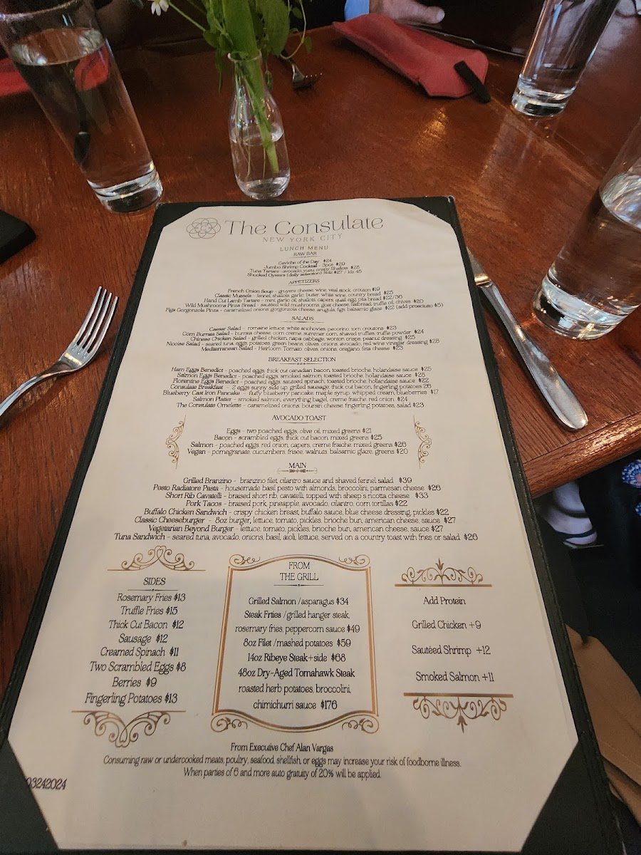 The atmosphere is just as appealing as the food. With its chic and stylish decor, The Consulate UWS is perfect for an intimate dinner or a laid-back gathering with friends. JT Bernhardt described the space as ideal for an afternoon of champagne and oysters, highlighting the inviting nature of the restaurant which encourages both relaxation and delight.